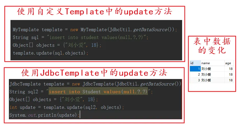 可以尝试着自定义封装一个update方法,让其达到和JdbcTemplate一样的效果。