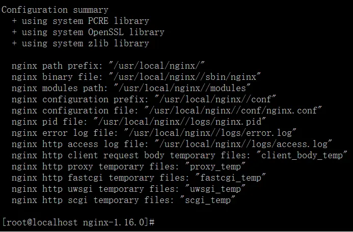 tar -xzf nginx-1.16.0.tar.gz # 解压源码包 cd nginx-1.16.0 ./configure --prefix=/usr/local/nginx/ --with-http_stub_status_module --with-http_ssl_module # 进入源码包内执行预编译