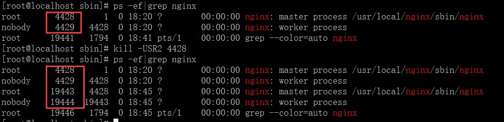 kill -USR2 4428 # 向主进程发送USR2信号,Nginx会启动一个新版本的master进程和工作进程,和旧版一起处理请求