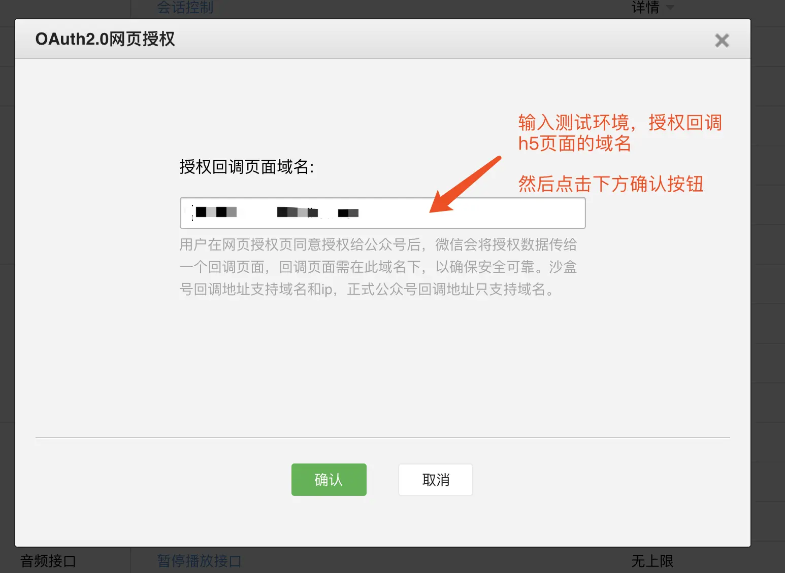 - 在“体验接口权限表” - “网页服务” - “网页帐号” - “网页授权获取用户基本信息” - 点击后面的“修改”按钮,出现如下弹窗,配置授权回调页面的域名