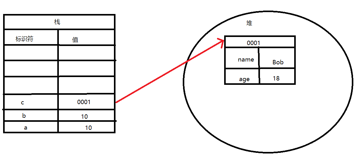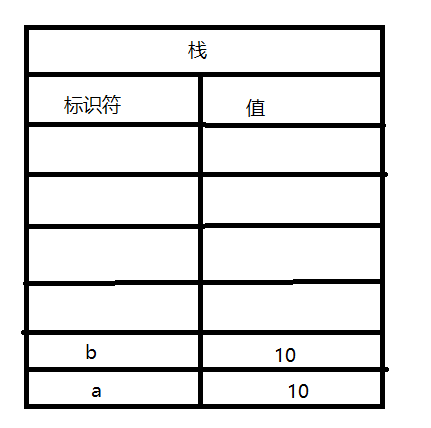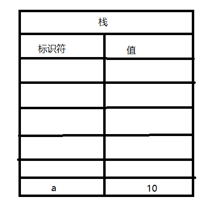 实际就是在标识符中添加了一个变量a,在栈中开辟了一片内存,存放了一个值是数字10,a标识符对应的值是10