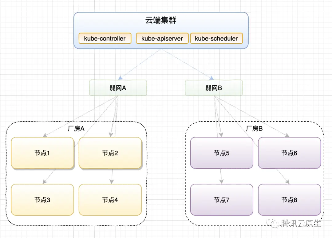 我们来以一个常见的厂房模型来介绍一下用户在弱网环境下使用传统 kubernetes 遇到的问题以及 TKE 边缘容器团队在此类场景下提出的解决方案。