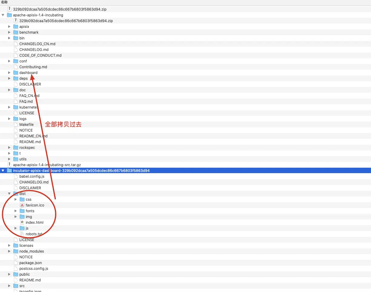 #编译完成后,文件在dist目录下,我们将打好的 dist目录下的内容全部拷贝到apache-apisix-1.4-incubating/dashboard目录下