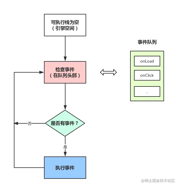 - 一旦执行栈中的所有同步任务执行完毕(此时JS引擎空闲),系统就会读取任务队列,将可运行的异步任务添加到可执行栈中,开始执行。
