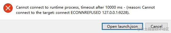 原因是开启了--inspect-brk,但是端口对不上,可以修改成默认值9229