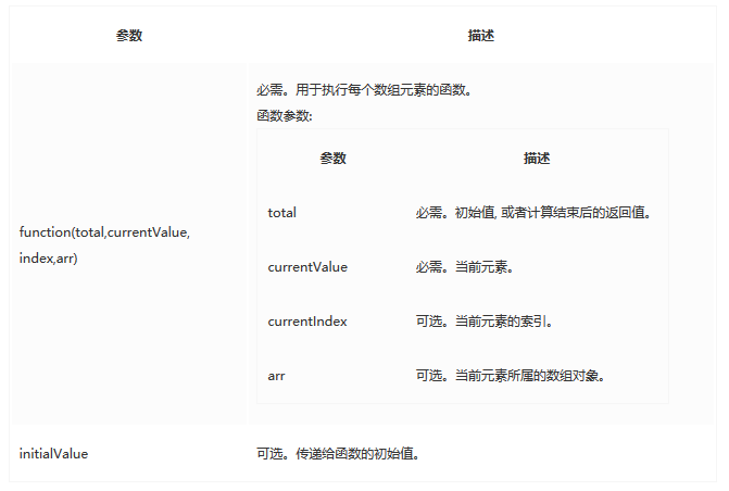 array.reduce(function(total, currentValue, currentIndex, arr), initialValue)