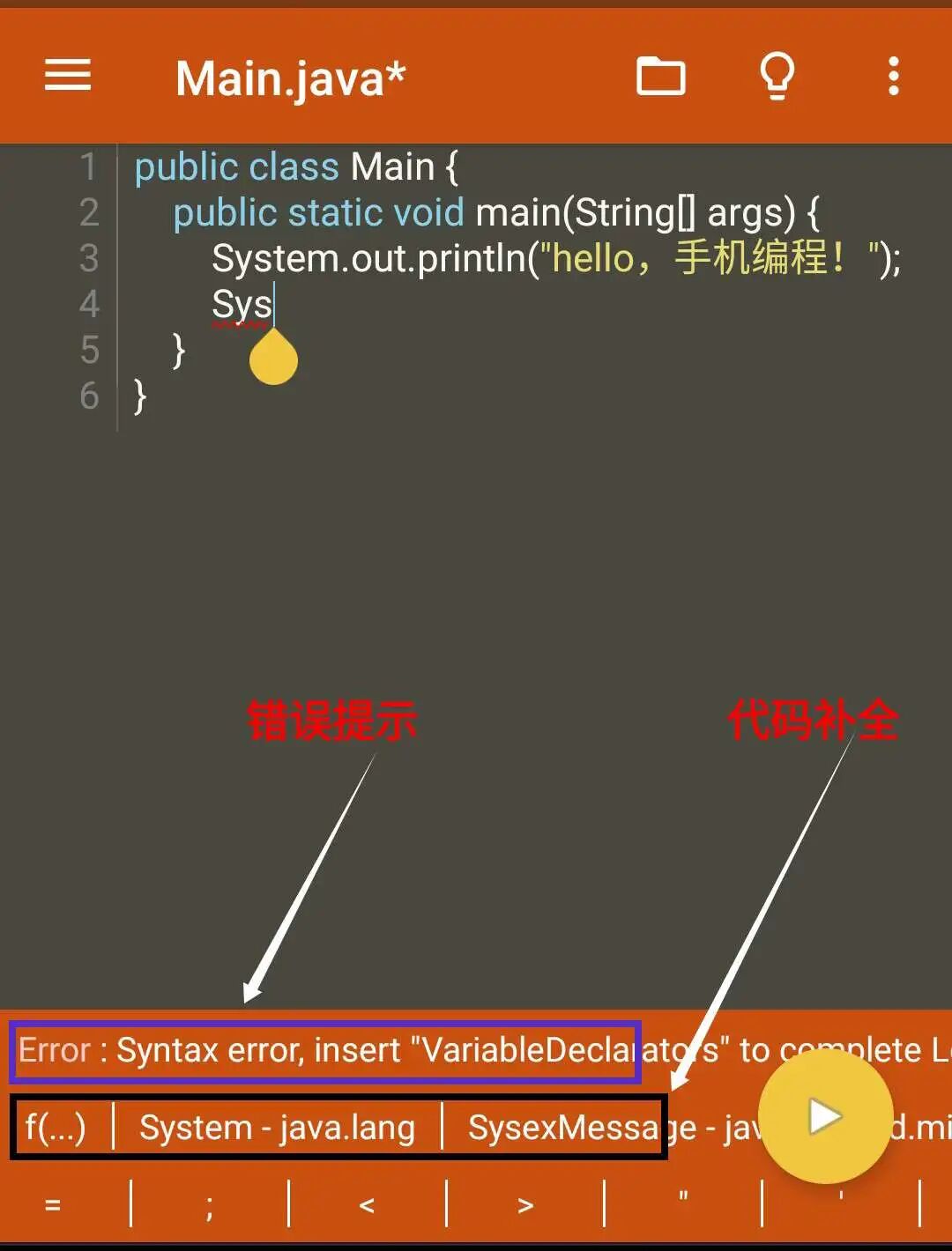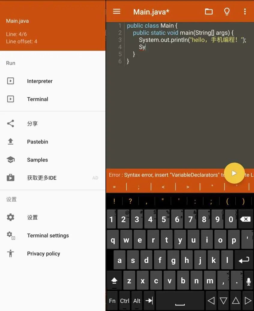 – 扩展键盘栏,包含您用Java编程所需的所有符号。