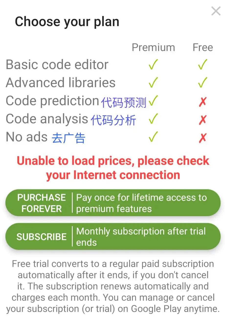 而且,Jvdroid 包含内购,代码预测,去广告等强大的功能必须要购买才能用,更坑的是,必须要在 google play 才能购买。