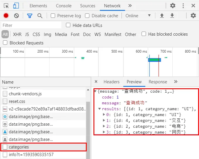 C、在/categories 接口中完成获取xzqa_category数据表记录的功能: /categories 接口的代码如下: