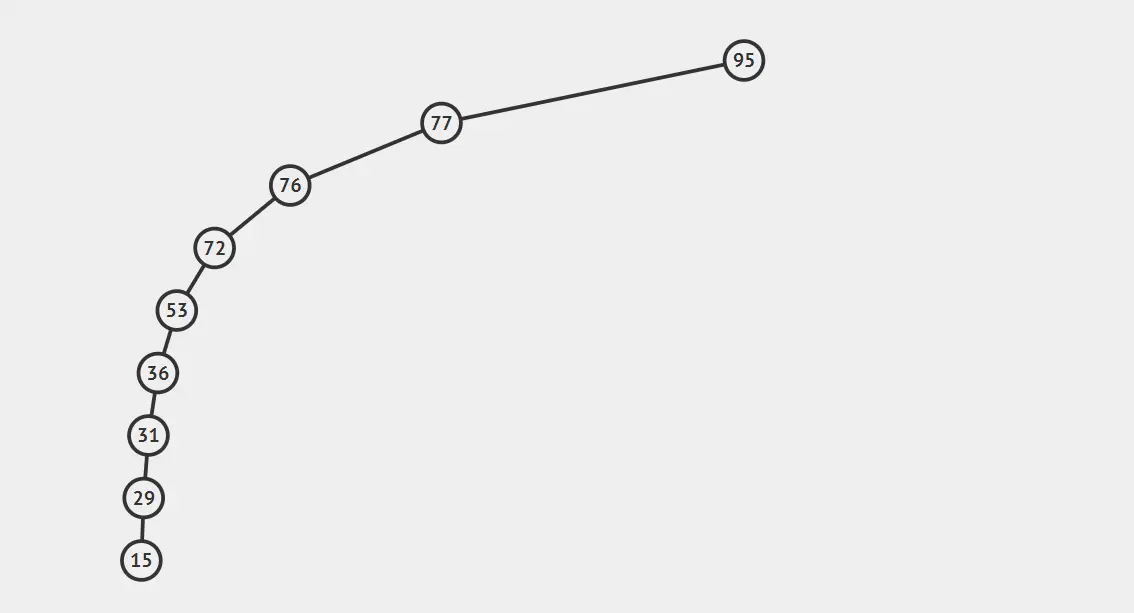 但是,你有没有注意到,它的最坏情况依旧是O(logN)。二叉查找树在一定条件下可能会退化成链表,就像下图所示,这明明就是一个弯曲的链表!