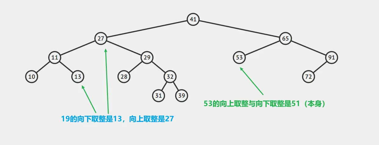 向上取整是指大于等于该键的最小键,向下取整是指小于等于该键的最小值。
