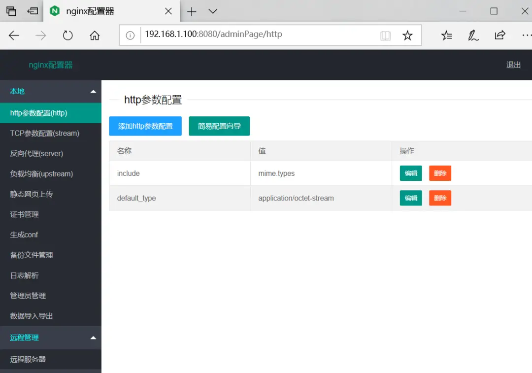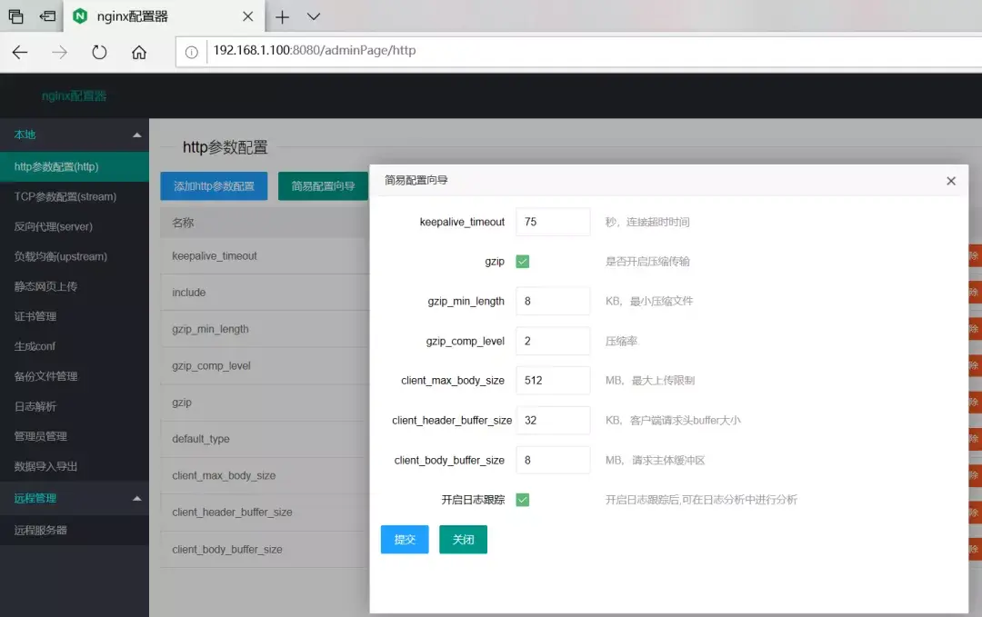 在http参数配置中可以配置nginx的http项目,进行http转发, 默认会给出几个常用配置, 其他需要的配置可自由增删改查。可以勾选开启日志跟踪, 生成日志跟踪配置项, 每天0点时刻可生成上一天的日志分析报告。由于日志文件access.log文件过大, 默认只保留7天的log文件, 但分析报告可一直保留。