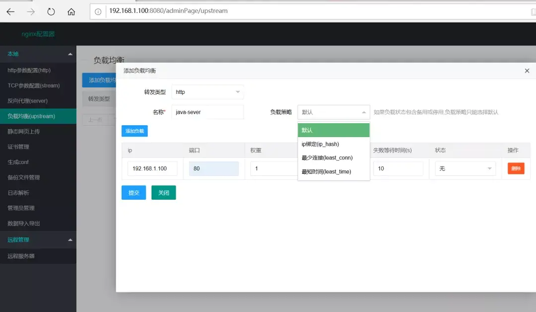 在负载均衡中可配置nginx的负载均衡即upstream项功能, 在反向代理管理中可选择代理目标为配置好的负载均衡。