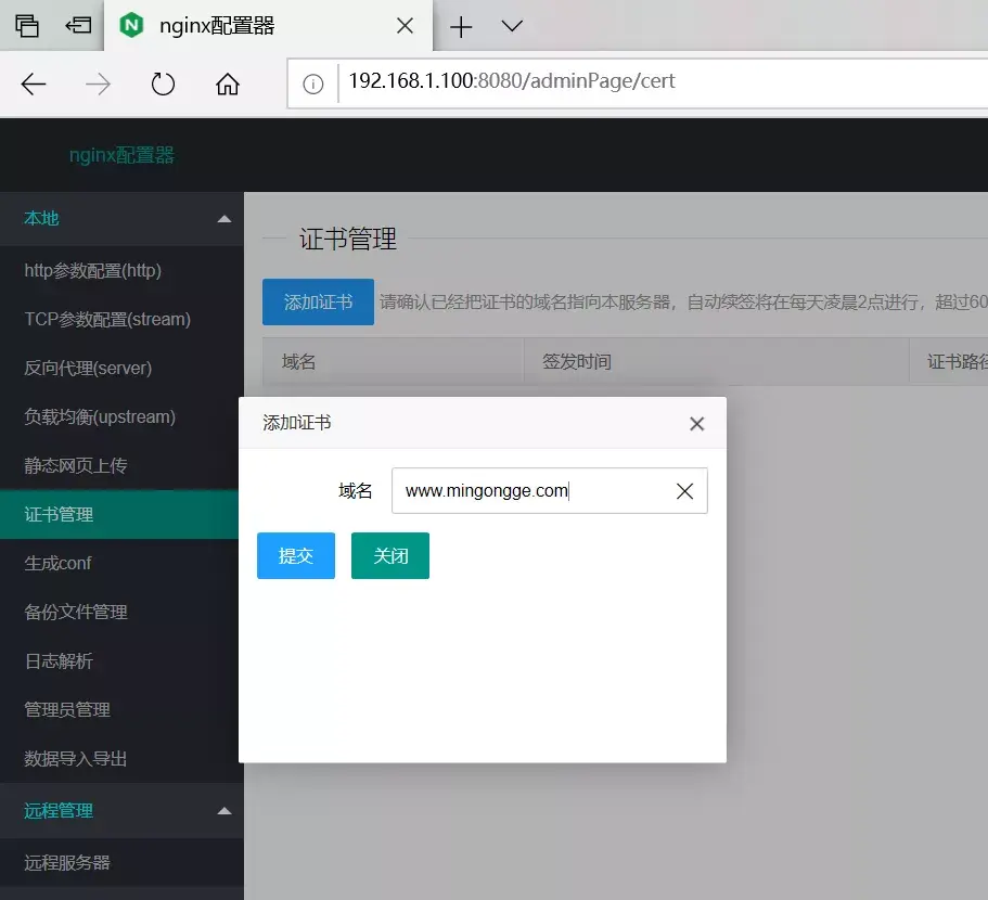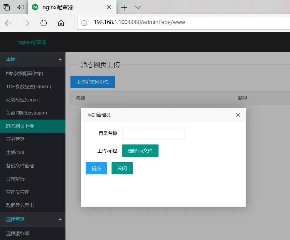 NginxWebUI是一款方便实用的nginx 网页配置工具,可以使用 WebUI 配置 Nginx 的各项功能,包括端口转发,反向代理,ssl 证书配置,负载均衡等,最终生成「nginx.conf」配置文件并覆盖目标配置文件,完成 nginx 的功能配置。