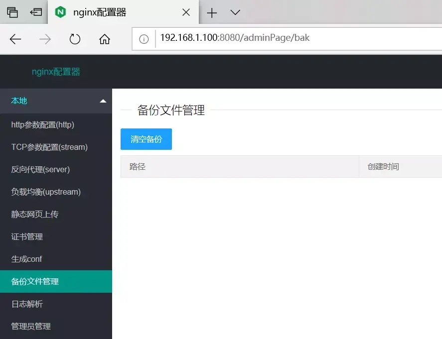 备份文件管理, 这里可以看到nginx.cnf的备份历史版本, nginx出现错误时可以选择回滚到某一个历史版本。
