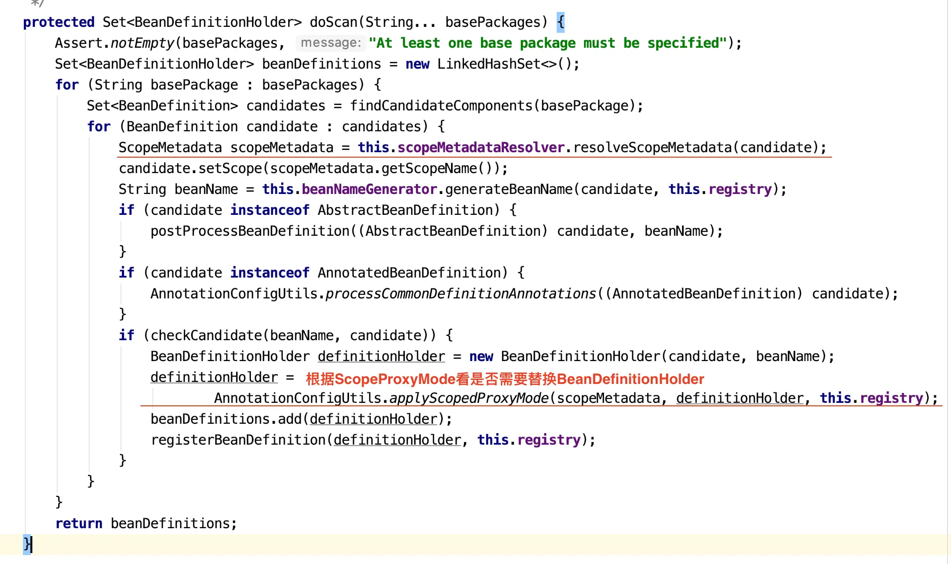 从cglib生成的动态代理类找不到突破口,那么我们只能从Spring扫描bean开始了,看下哪些地方使用到@RefreshScope注解。Spring扫描bean的源码在ClassPathBeanDefinitionScanner类的doScan方法,源码如下图所示。