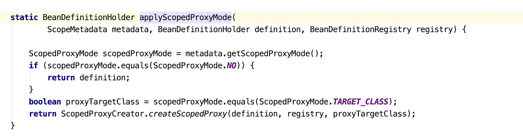 如上图中画线代码所示,Spring在将BeanDefinition注册到工厂之前,会先解析BeanDefinition获取bean的scope和ScopedProxyMode,即ScopeMetadata。最后根据代理模式ScopedProxyMode判断是否需要为该BeanDefinition生成代理类的BeanDefinition。AnnotationConfigUtils的applyScopedProxyMode方法的源码如下图所示。