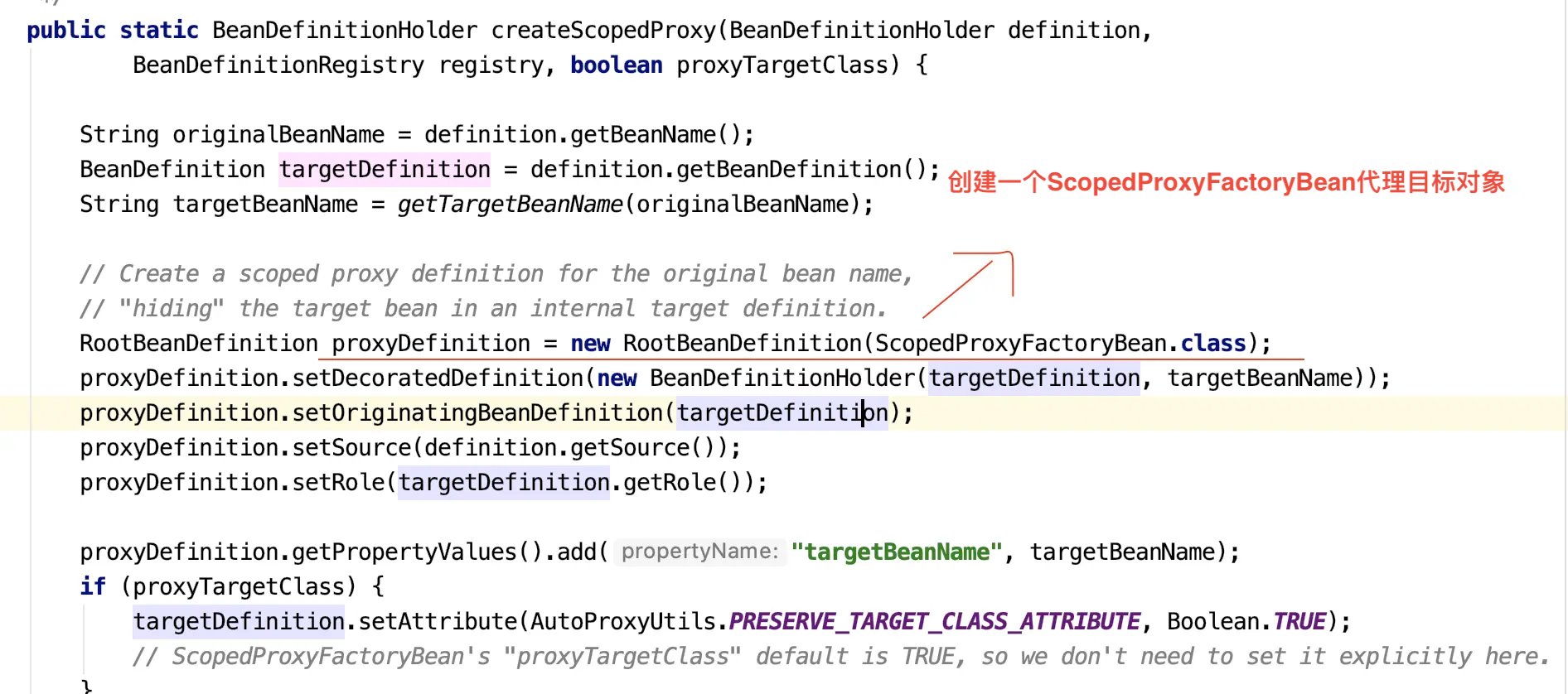 注意看图中画线的代码,该方法会创建一个新的BeanDefinition,该BeanDefinition的bean类型为ScopedProxyFactoryBean,并且为该bean注入属性targetBeanName,targetBeanName为目标bean的beanName,最后返回该BeanDefinition。