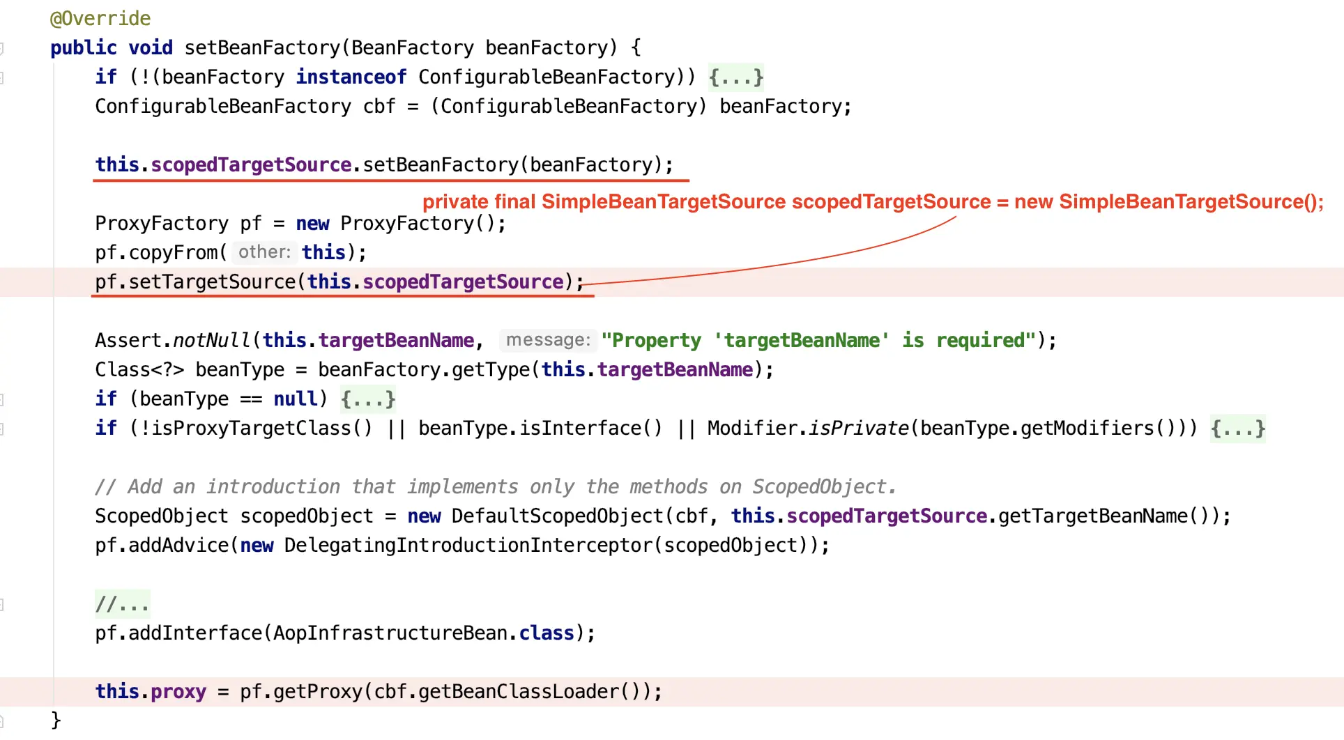 ScopedProxyFactoryBean实现BeanFactoryAware接口,xxxAware接口的方法在bean被实例化且注入属性完成之后,在调用bean的初始化方法之前被调用,代理对象实际是在setBeanFactory方法中创建的。setBeanFactory方法源码如下图所示。