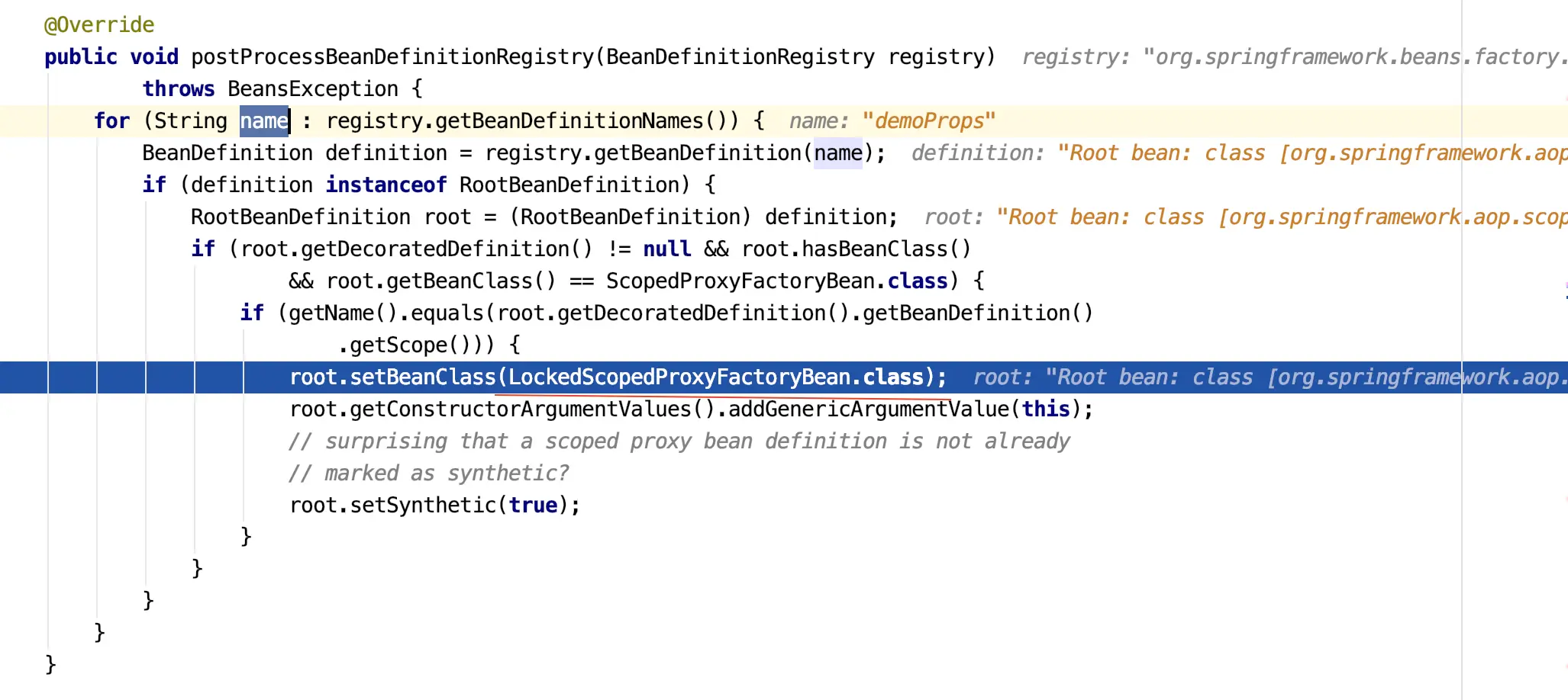 截图中少了部分代码,原来的BeanDefinition在该方法的后面会注册到bean工厂,但使用的是getTargetBeanName方法返回的beanName,就是将原来的beanName加上前缀scopedTarget.。也就是说原来的BeanDefinition被换了个名称注册到bean工厂了,beanName为scopedTarget.[原来的beanName]。