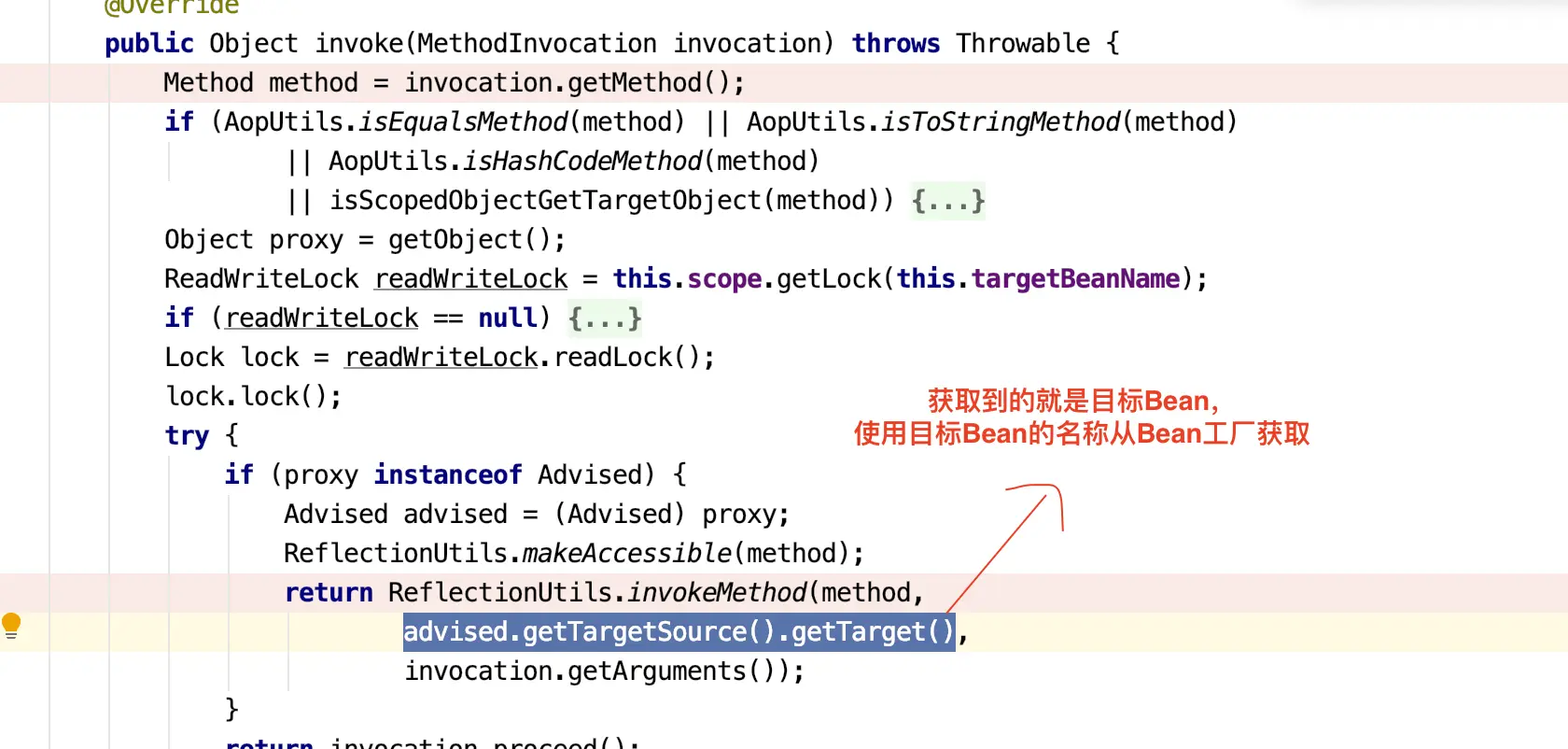 invoke方法首先获取代理对象,然后通过反射调用目标方法,而在调用目标方法时,传入的目标对象是通过代理对象的TargetSource获取的,也就是从bean工厂中根据目标beanName获取的。