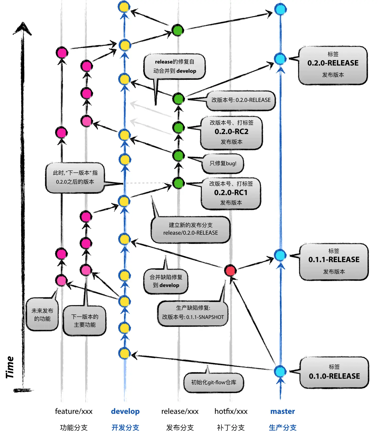 - hotfix/xxx:补丁分支。软件正式发布以后,难免会出现bug。这时就需要创建一个分支,进行bug修补。补丁分支是从master分支上面分出来的,修补结束以后,再合并进master和develop分支。
