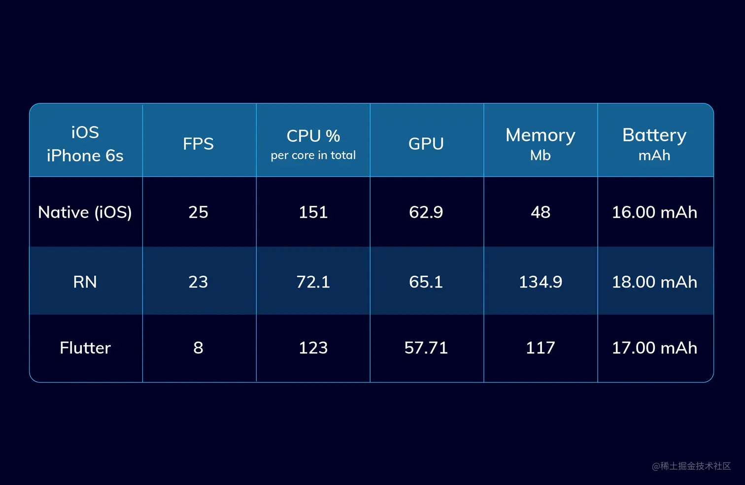 - FPS,React Native的结果比Flutter和Swift差。原因是无法在iOS上使用IoT编译。