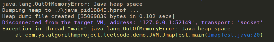 设置虚拟机参数后,然后运行这段代码,就会发生堆内存溢出异常,并在根目录下生成快照文件 java_pid10840.hprof。