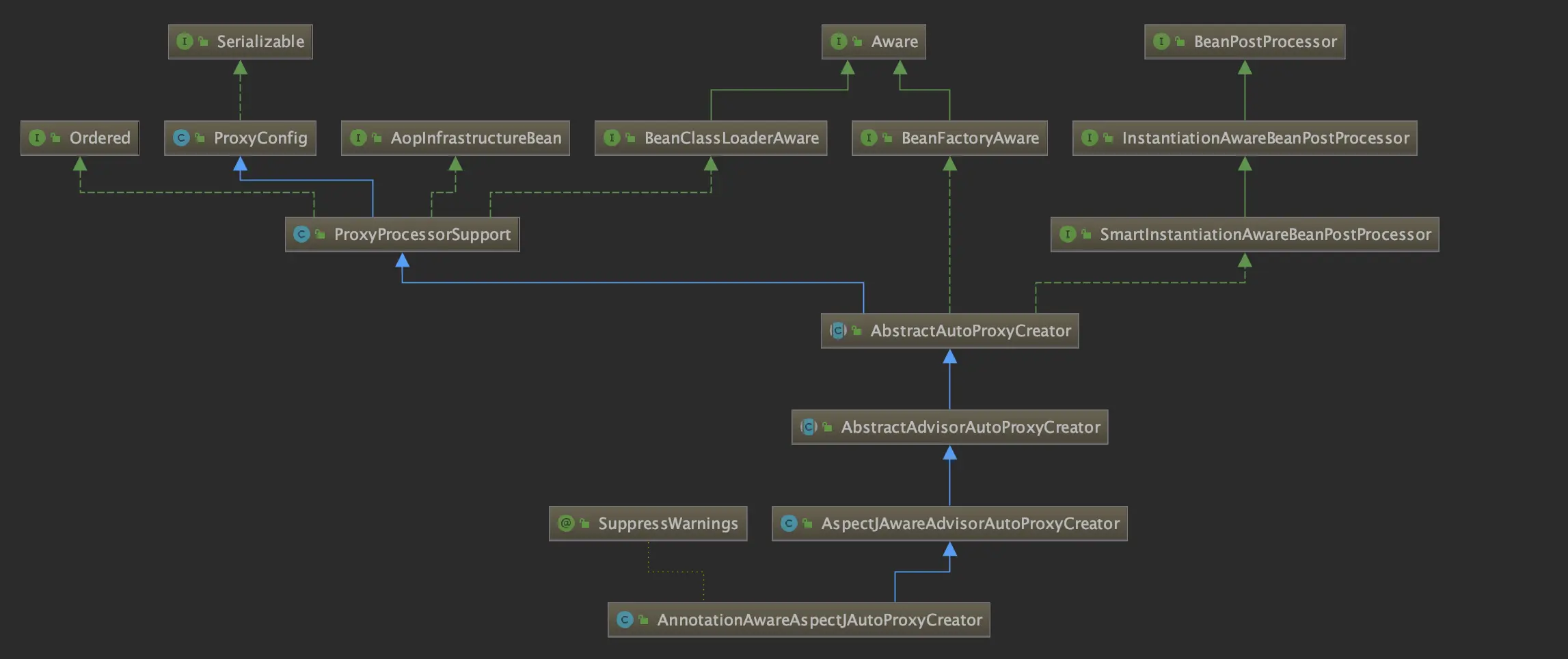 由@EnableAspectJAutoProxy导入的AspectJAutoProxyRegistrar注册到beanfactory中,作为一个BeanPostProcessor存在