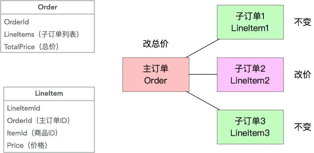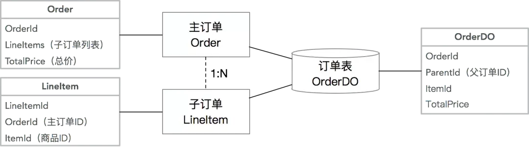 多个关联的Entity合并一张数据库表:这种情况通常出现在拥有复杂的Aggregate Root - Entity关系的情况下,且需要分库分表,为了避免多次查询和分库分表带来的不一致性,牺牲了单表的简洁性,提升查询和插入性能。常见的案例如主子订单模型: