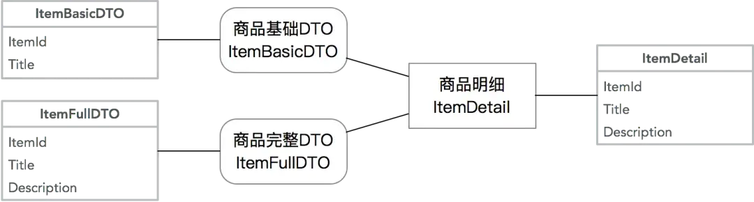 从复杂Entity里抽取部分信息形成多个DTO:这种情况通常在Entity复杂,但是调用方只需要部分核心信息的情况下,通过一个小的DTO降低信息传输成本。同样拿商品模型举例,基础DTO可能出现在商品列表里,这个时候不需要复杂详情: