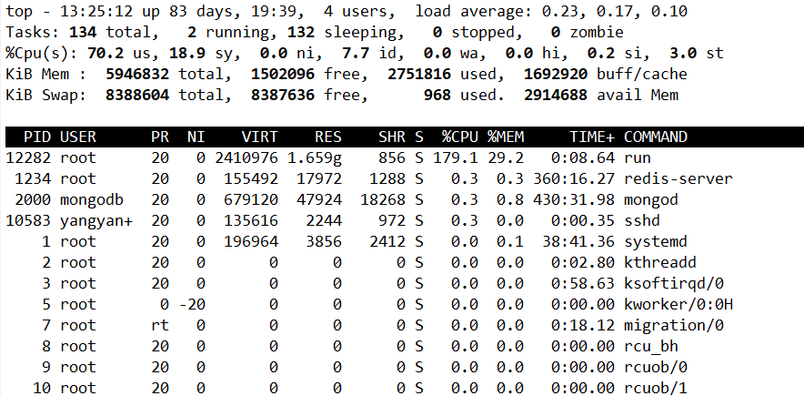 通过执行top命令查看到该程序占用的CPU、内存较高。