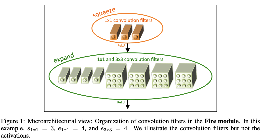 卷积的总参数量为(number of input channels)(number of filters)(3*3),使用squeeze layers降低输入维度,能够降低整体的计算量。