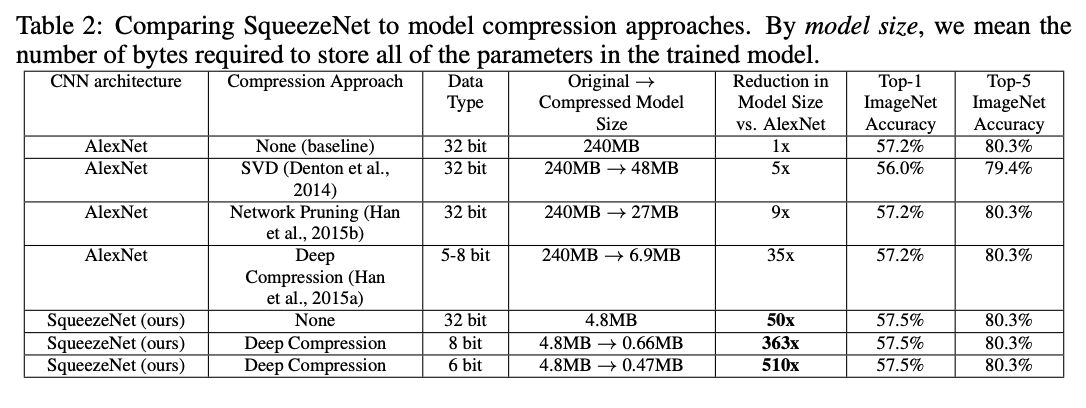 与AlexNet相比,相同准确率下,SqueezeNet仅需要1/50的参数量,量化后,最多可以缩小到1/510的参数量。
