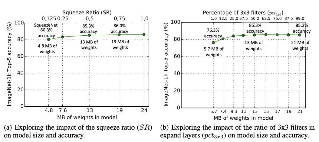 论文对Fire模块的设定进行了探索实验,主要对比squeeze层的压缩比例以及expand层中的卷积占比。