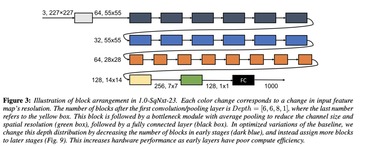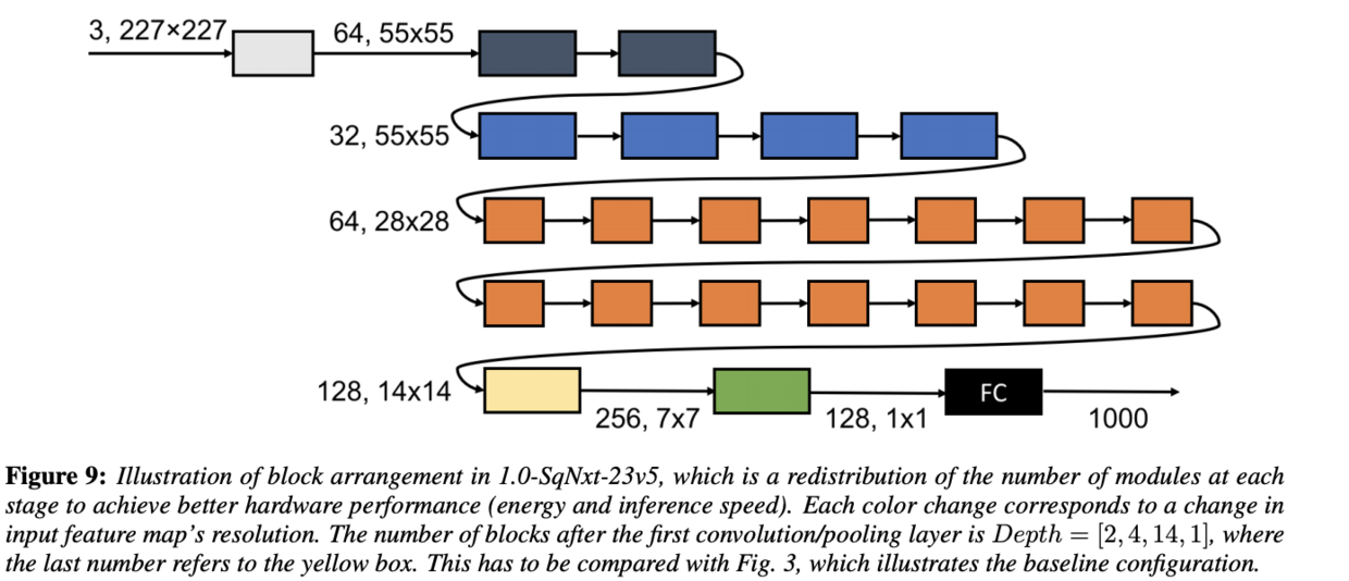 SqueezeNext在SqueezeNet的压缩思想上,结合分离卷积进行参数压缩改进,文中的模拟硬件推理性能的实验做的很精彩,可以看到作者如何一步一步地改进网络的整体结构,有兴趣的可以去看看原文。
