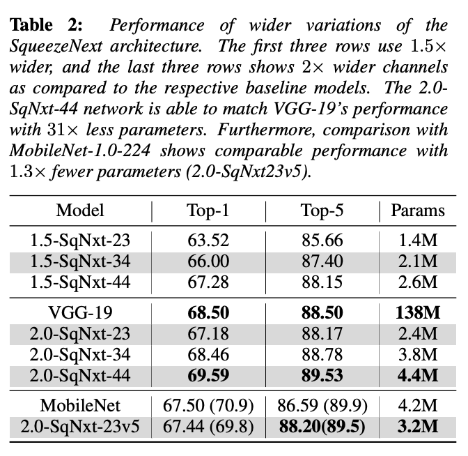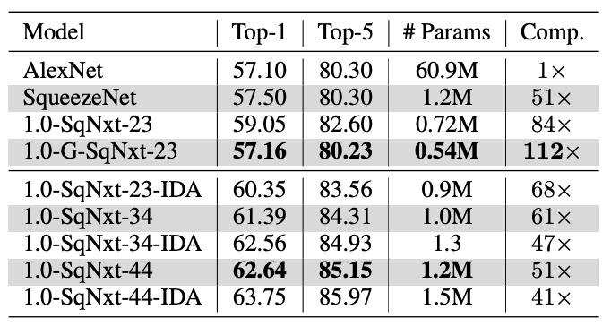 论文对比了不同网络以及不同版本的SqueezeNext,包括不同的网络长度,以及加入不同的结构。表中的1.0代表基础的层维度设置,G代表卷积的group size设置为2,后面的数字为总层数,IDA代表使用Iterative Deep Aggregation,融合多层进行输出。
