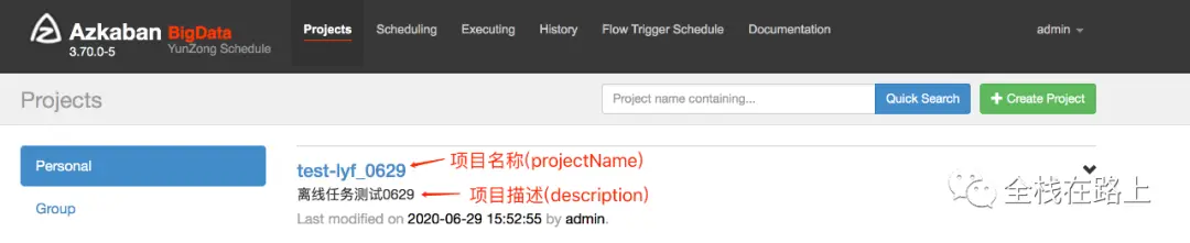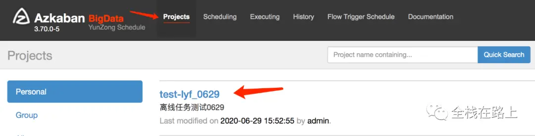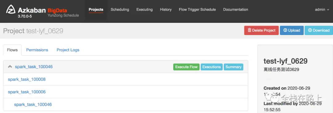 zip 压缩包上传成功之后,我们可以到 Azkaban 的 web UI 里去查看已经创建的工作流。 在 Projects 栏里可以看到刚刚通过魔盒创建成功的工作流: