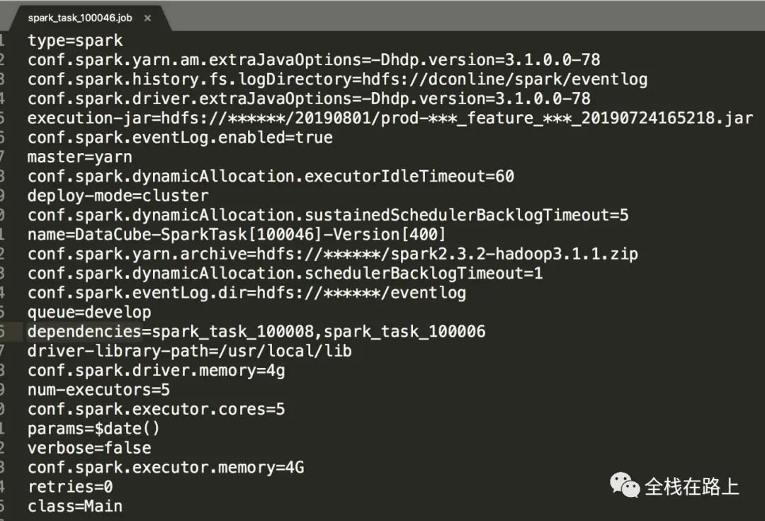 - 上图中,我创建了一个 spark 任务:离线任务测试001(离线任务测试001为魔盒中记录的任务名字,对应到 Azkaban 中的 job 名称为为: