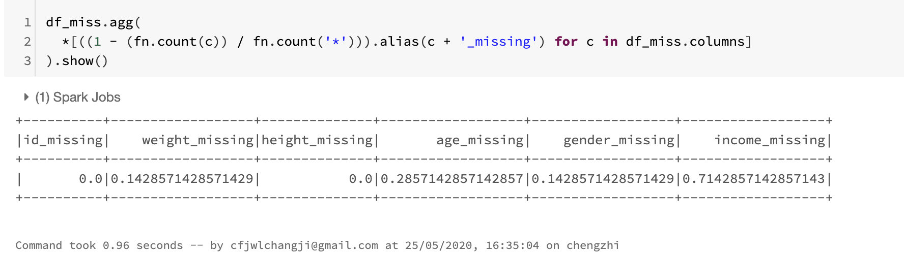 我们可能还会向看下各列缺失值的情况,究竟有多少比例缺失了。由于我们需要对每一列进行聚合,所以这里又用到了agg这个方法: