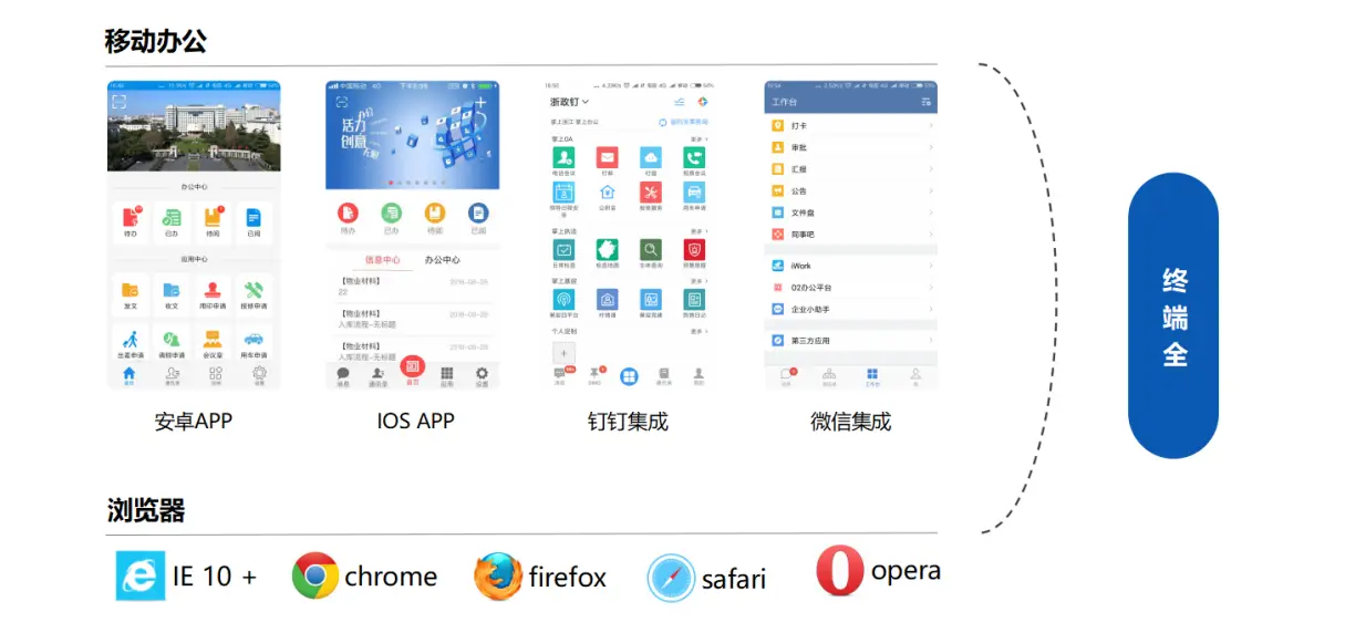O2OA覆盖了几乎全部终端。您可以使用IE10+、Chrome、Firefox、Safari、Opera等主流浏览器(包括使用相同内核的其他浏览器如:360浏览器、百度浏览器、猎豹浏览器等等)。除此之外,您还可以使用安卓、IOS移动APP进行流程处理等办公,也可以将O2OA与企业钉钉、微信集成,实现真正的随时随地办公。