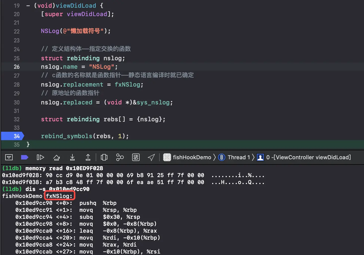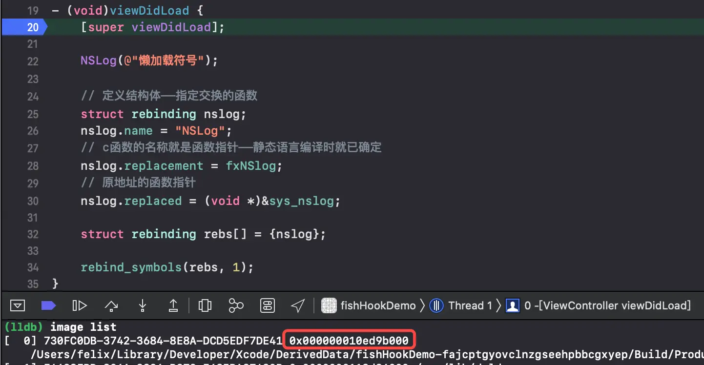 NSLog在Foundation库中,在每个手机的内存地址都不一样,不能通过CMD+B就能确定其内存地址 - 这里fishhook在运行的时刻会动态获取到
