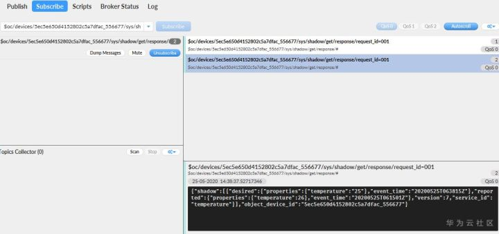 }(5)选择“Subscribe”页签,看到平台下发的设备影子数据。