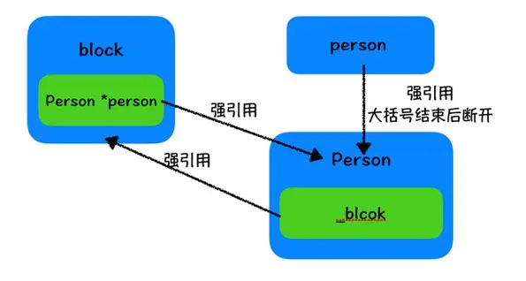 首先为了能随时执行block,我们肯定希望person对block对强引用,而block内部对person的引用为弱引用最好。