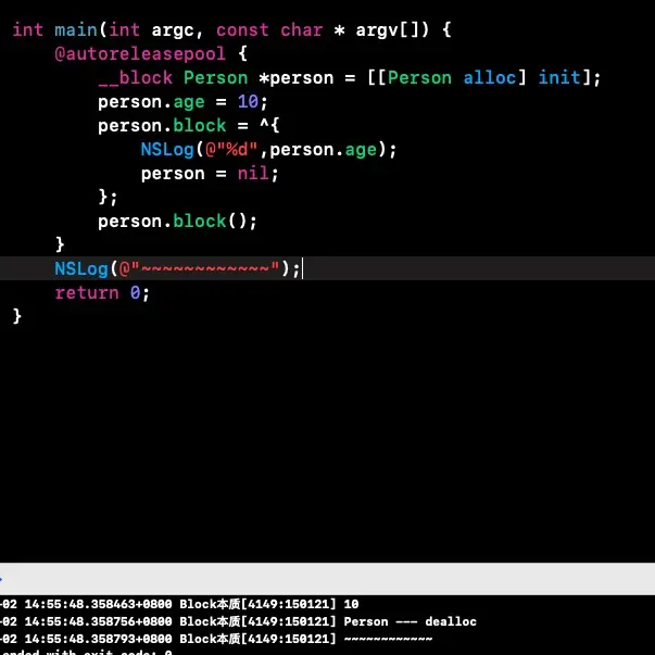 我们上面也提到过__weak会使block内部将指针变为弱指针。block对person对象为弱指针的话,也就不会出现相互引用而导致不会被释放了。