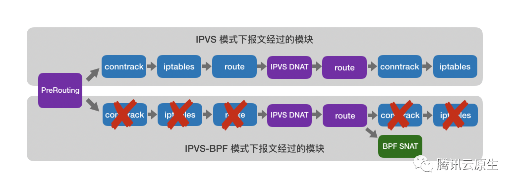 针对nf_conntrack带来的性能问题,腾讯TKE团队设计实现了IPVS-BPF。核心思想是绕过nf_conntrack,减少处理每个报文的指令数目,从而节约CPU,提高性能。其主要逻辑如下: