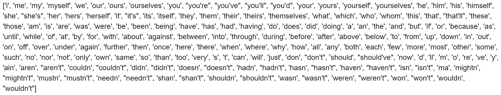 这些是停用词的例子。停用词通常指的是语言中最常见的单词,但是我们没有一个通用的停用词列表。