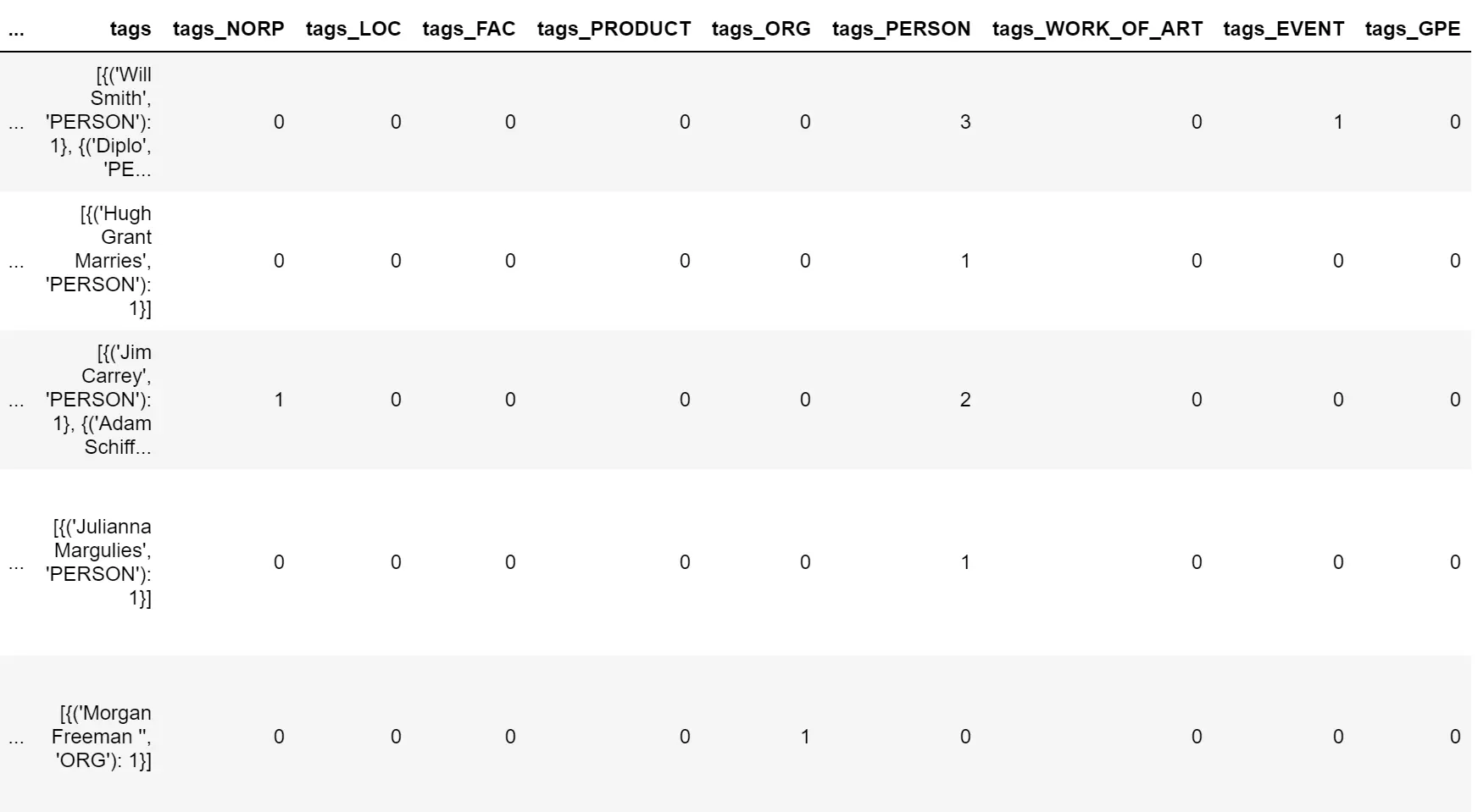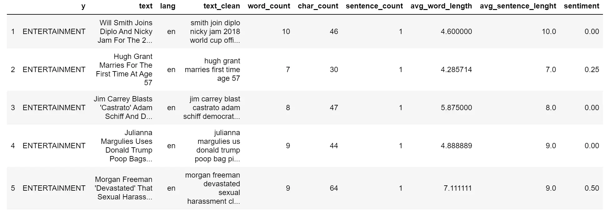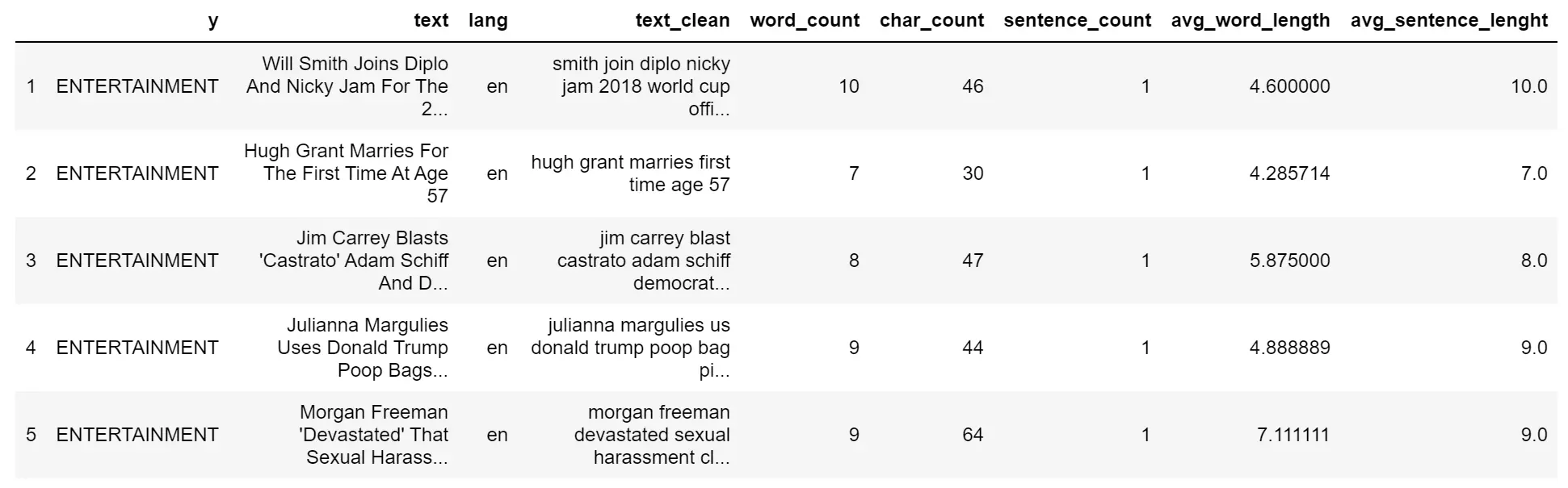 现在已经设置好了,我将从清理数据开始,然后从原始文本中提取不同的细节,并将它们作为数据帧的新列添加。这些新信息可以作为分类模型的潜在特征。