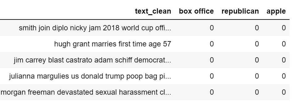 CountVectorizer将文本文档集合转换为计数矩阵。我将用3个n-grams来举例:“box office”(经常出现在娱乐圈)、“republican”(经常出现在政界)、“apple”(经常出现在科技界)。