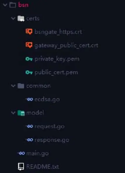 - bsngate_https.crt:节点网关 API 的 Https 公钥证书(用于对请求网关 API 地址所需加载的公钥证书)
